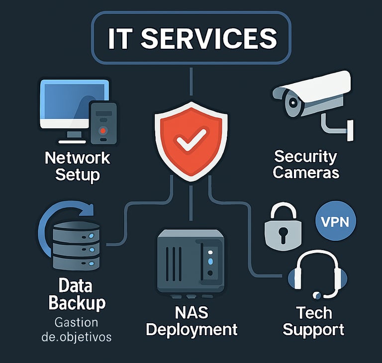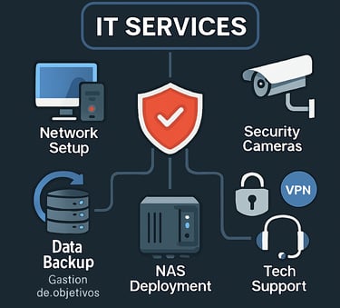 Ofrecemos soluciones tecnológicas integrales para mantener tu empresa conectada, segura y funcionando con eficiencia. Nuestro equipo se encarga de la configuración de redes en oficinas, instalación de cámaras de vigilancia, configuración de respaldos automáticos, instalación de discos NAS, implementación de firewalls, configuración de VPN , diseño y desarrollo de páginas web personalizadas, y soporte técnico continuo.